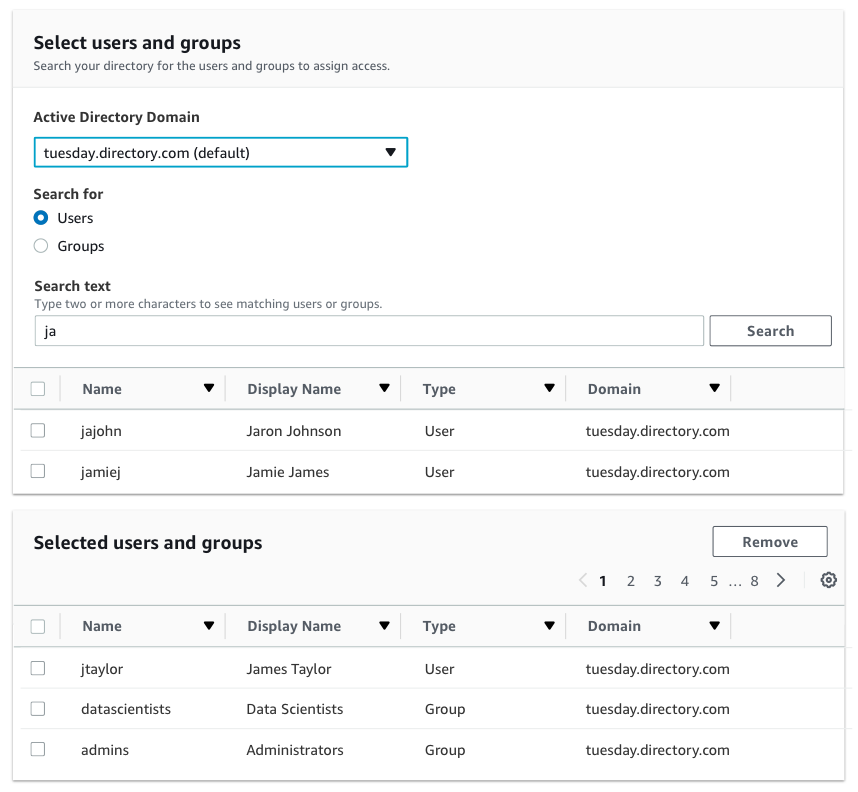 1. The Microsoft AD Picker Widget - This is a variant of the picker widget, specifically for the case when customers have a Microsoft AD directory connected as their identity source. This widget is different because due to the latency to list users from a potentially very large Microsoft AD directory, some alternate methods and interaction patterns to look up users were necessary. It also needed to account for multiple domains within a Microsoft AD directory.
